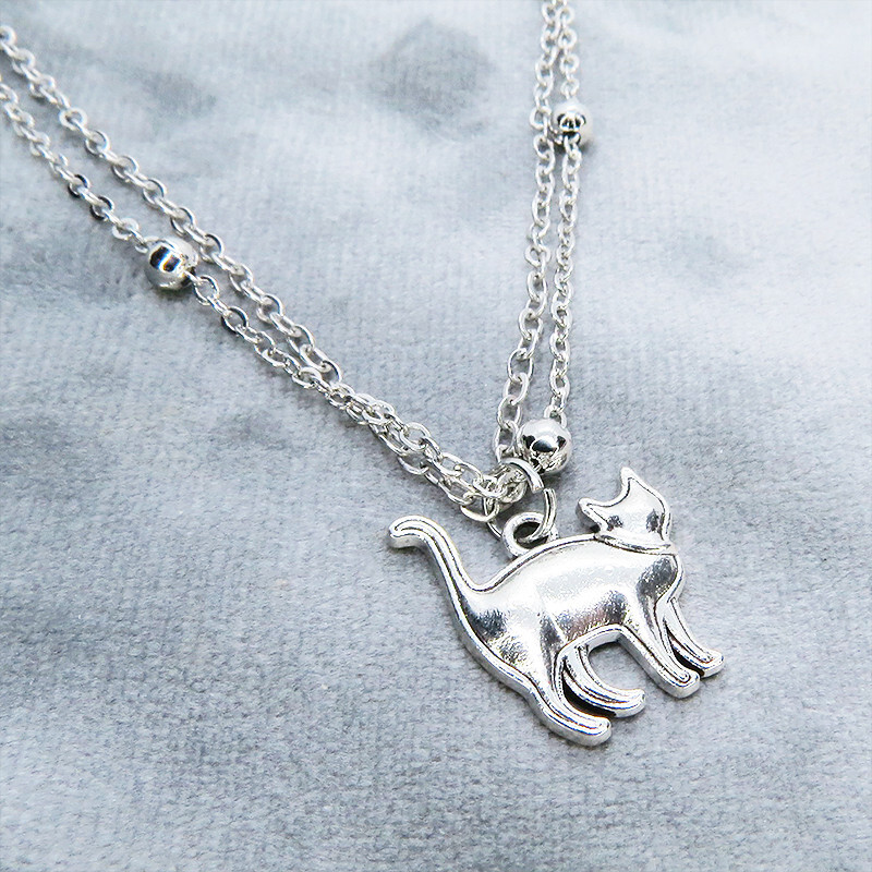 - シルバーカラー 歩き猫のダブルチェーンブレスレット ビーズ付チェーン アジャスター付