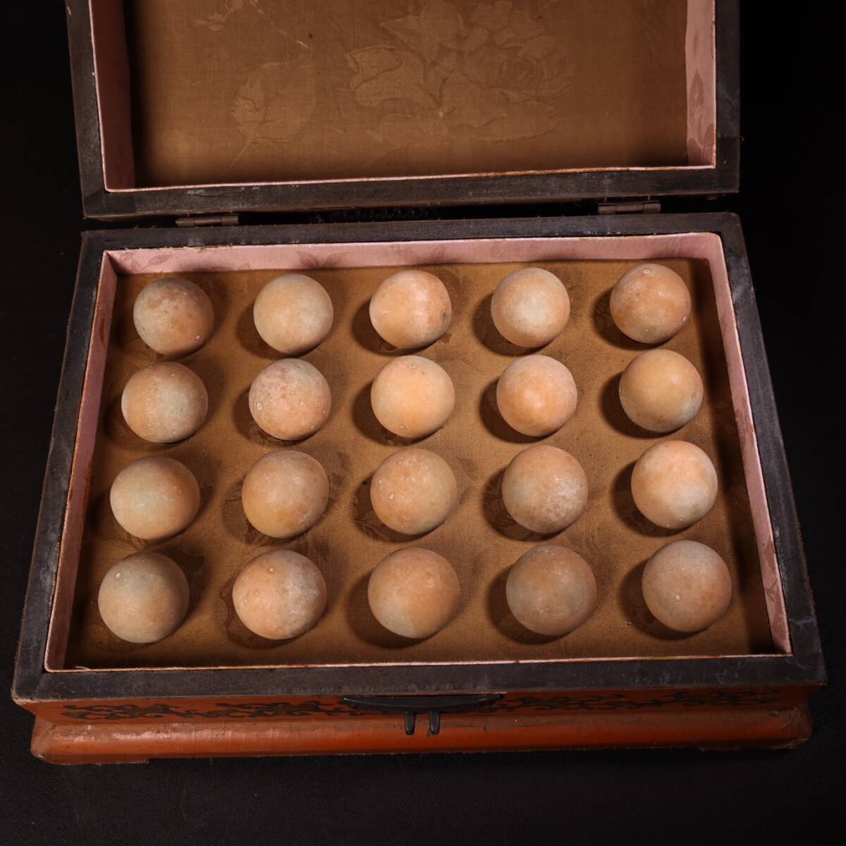 > 『館蔵珍品 夜光石細密彫 石球 漆器箱付 置物 賞物』稀少珍蔵品 古賞物 貴重物品 収蔵品 中国古美術 時代物 古董品