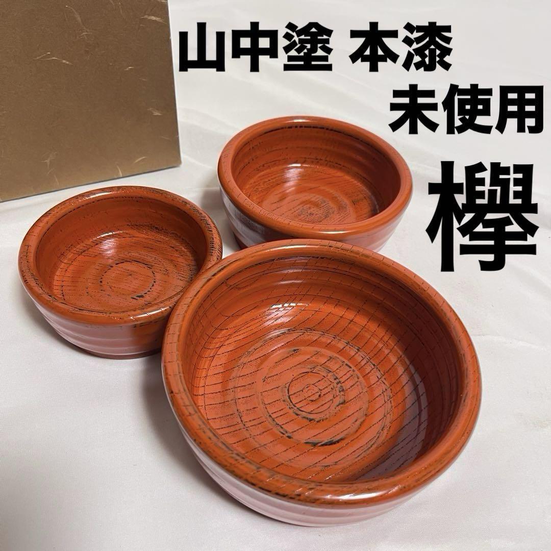 - 未使用 山中塗 根来 三ツ組 小鉢 3個 本漆塗 天然木 欅 朱塗 漆塗 漆器 三客 菓子器 菓子鉢 うるし JAPAN