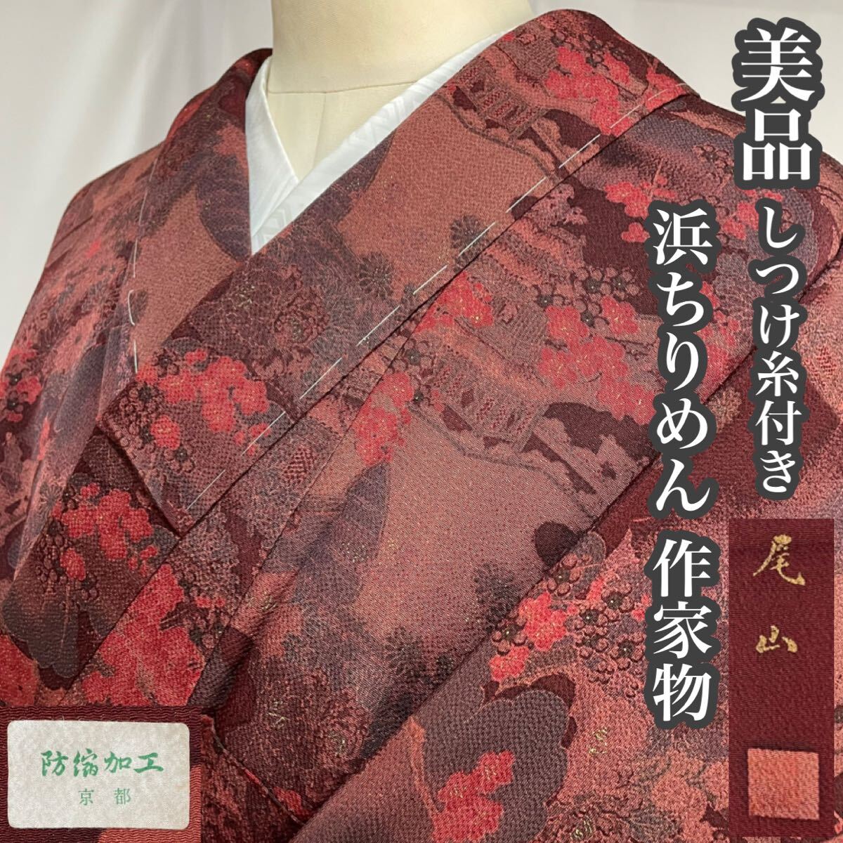 - #H426 美品 しつけ糸付き 作家物 落款「尾山」秀作特選 慶長百花山水文様 浜ちりめん 金彩加工 風景文 型染め 正絹 証紙付き【wellriver】