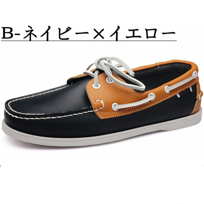 - シューズ メンズ デッキシューズ 本革 革靴 モカシン ドライビングシューズ レザーシューズ Zwse0069 B-ネイビー×イエロー 25.5cm