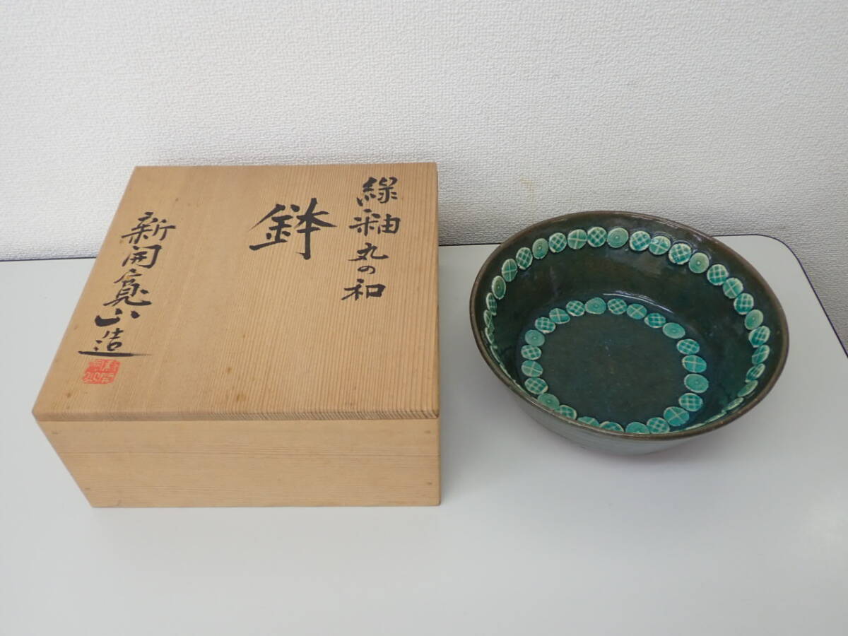 > 陶磁器-104; (角欠け有り) 新開寛山 緑釉 丸の和 鉢 径;約19.7×高さ;7.3cm 共箱 ★