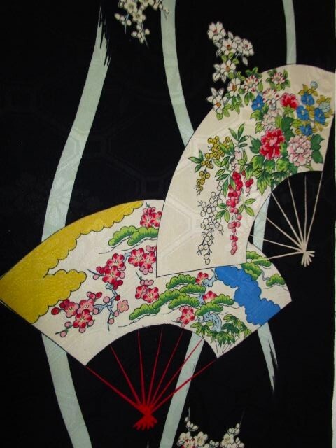 > E-132★黒地*扇*牡丹*梅*椿*ピラカンサス*綸子*古布はぎれ★文化人形/一閑張り/吊るし雛/市松人形