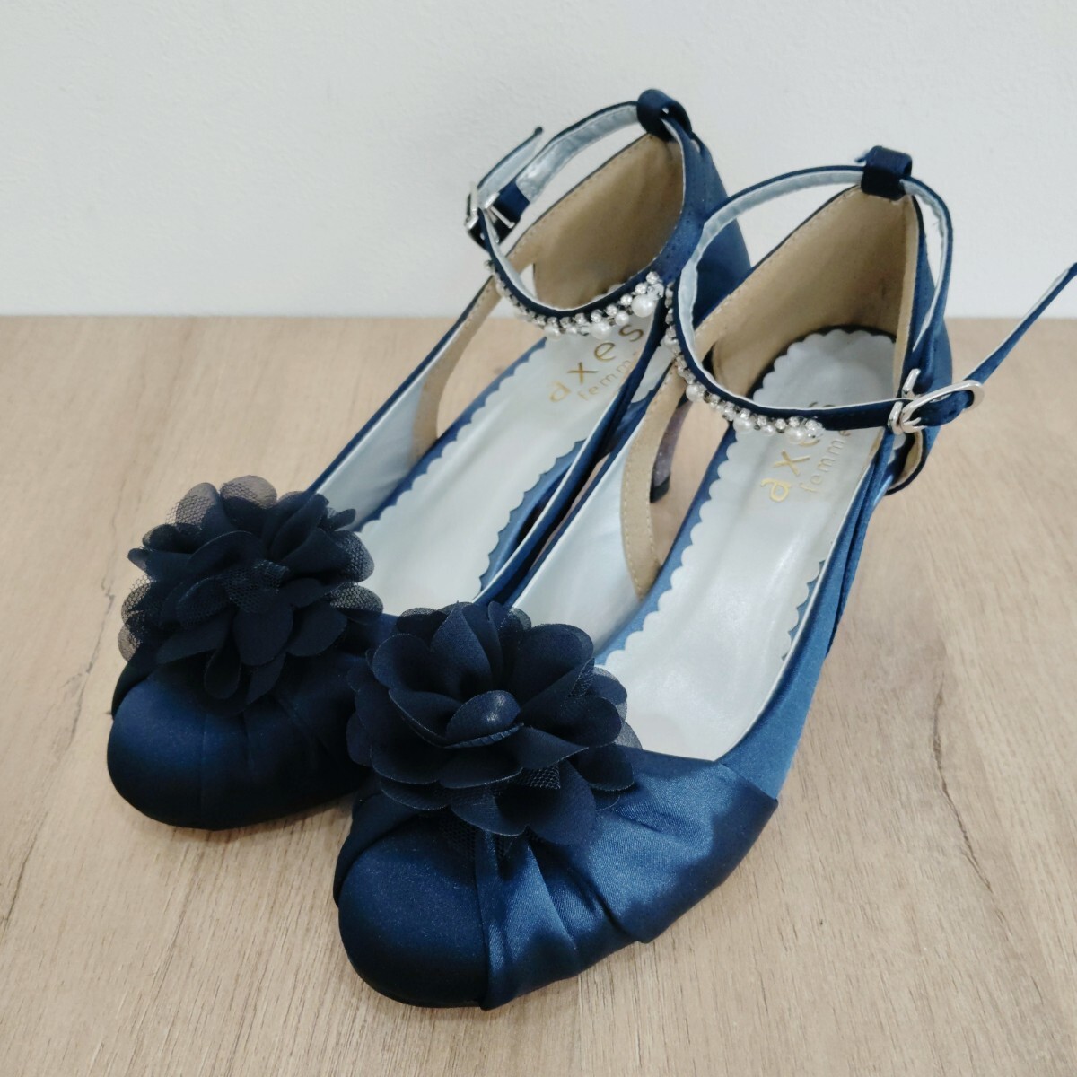 - axes パンプス ヒール 23.0〜23.5cm お花コサージュ付 アンクルストラップ ネイビー ブルー レディース