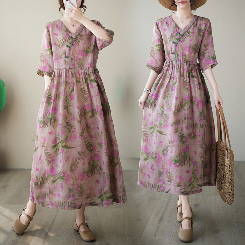 - 新入荷*上質 花柄ワンピース レディース 着痩せ Vネック 半袖 大きいサイズ 通勤 OL ロングワンピース プリント柄 切り替え 復古風
