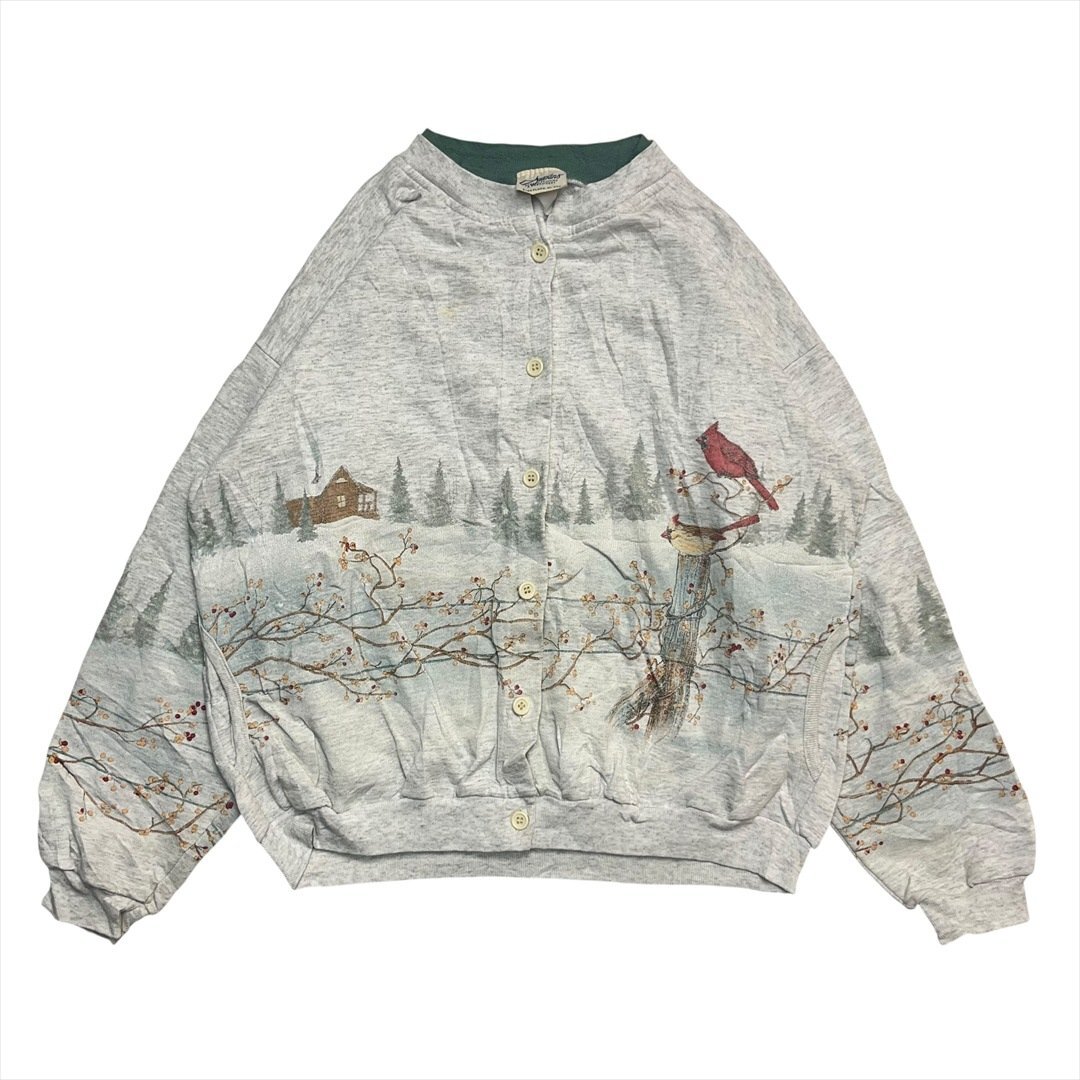 - Vintage Artisans ノスタルジック カーディナル プリント スウェット トレーナー グレー 古着 レディース FREE ボタンアップ カーディガン