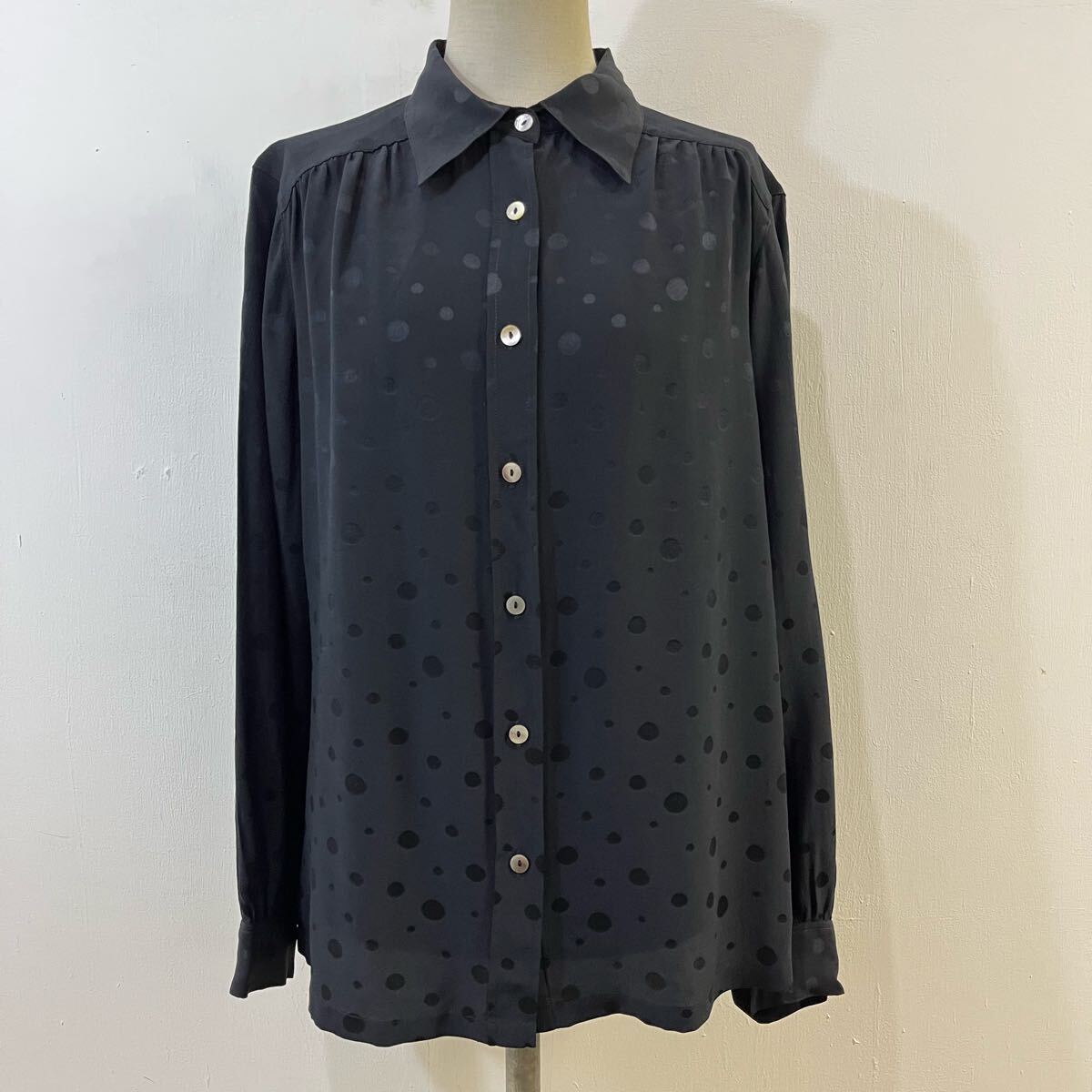 - VINTAGE MIMMO MODA シルクシャツ シルクブラウス ギャザーデザイン 水玉柄 総柄 黒 ブラック 絹100% 希少【レターパックプラス郵送可】D