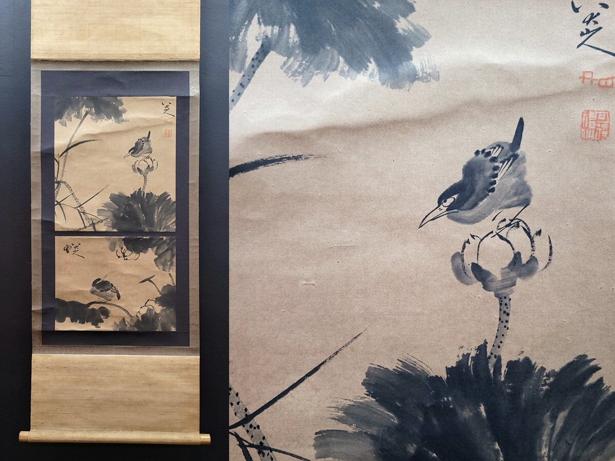 - 中国書画「明末清初 八大山人 花鳥図両小屏」肉筆紙本 掛け軸 墨寶妙品 書画立軸 巻き物 古美術 旧蔵出