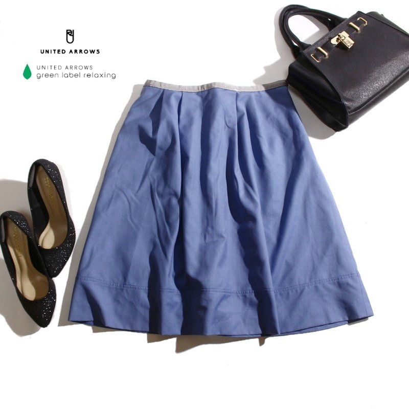 > 美品 ユナイテッドアローズ グリーンレーベルリラクシング 春 夏 ポリエステル Aライン フレアスカート 9号 38 淡い ブルー 水色 綺麗め