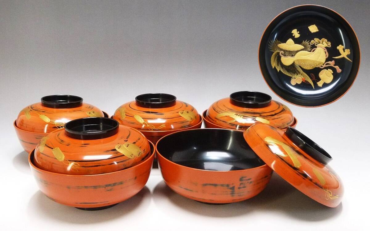 - 《ジャムルK》KKo0428-90◆根来塗 蒔絵 お椀 5客 まとめ 宝尽くし 小銭 宝袋 縁起物 漆器 朱塗 汁椀 蓋付 箱無し