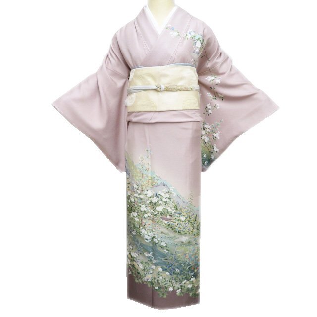 > 訪問着 着物 中古 正絹 袷 フォーマル 作家物 雅峰 落款 自然文様 花の図 灰梅色 多色 身丈164cm 裄67cm L きもの北條 A1228-5