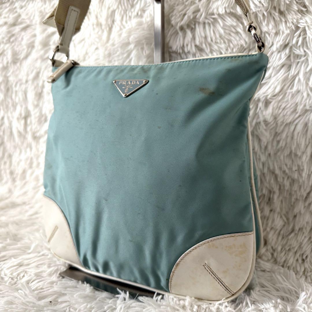 > PRADA プラダ サコッシュ ショルダーバッグ 斜めがけ 三角ロゴプレート テスートナイロン 白タグ レザー 水色 ライトブルー Lampoジップ