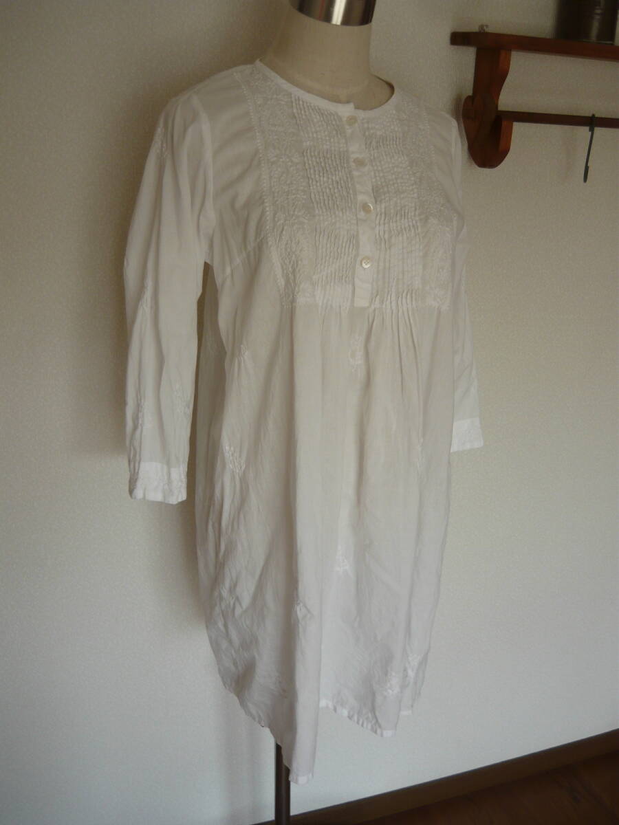- 中古*シサム工房・sisam*白薄手*刺繍*チュニック*7分袖位*Mサイズ位