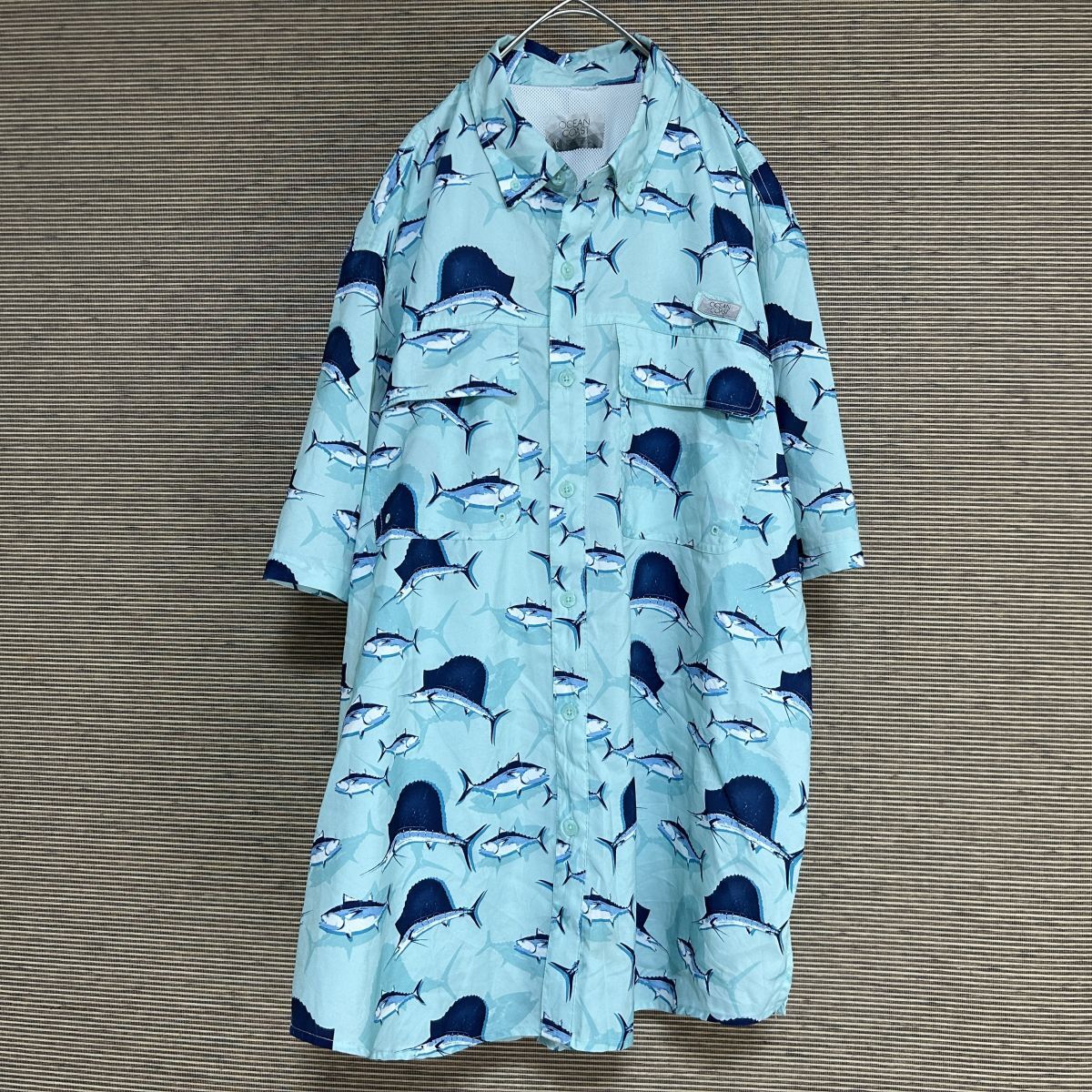 - アウトドアシャツ 総柄 魚 ミントグリーン カジキマグロ メッシュ*2 古着 入手困難 激レア 希少 人気 フィッシュ ボタニカル