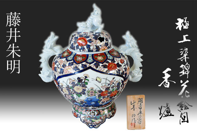 - 藤井朱明 作 極上染錦花蝶絵 龍耳 香炉 飾壷 高さ約49㎝ 共箱 木札付