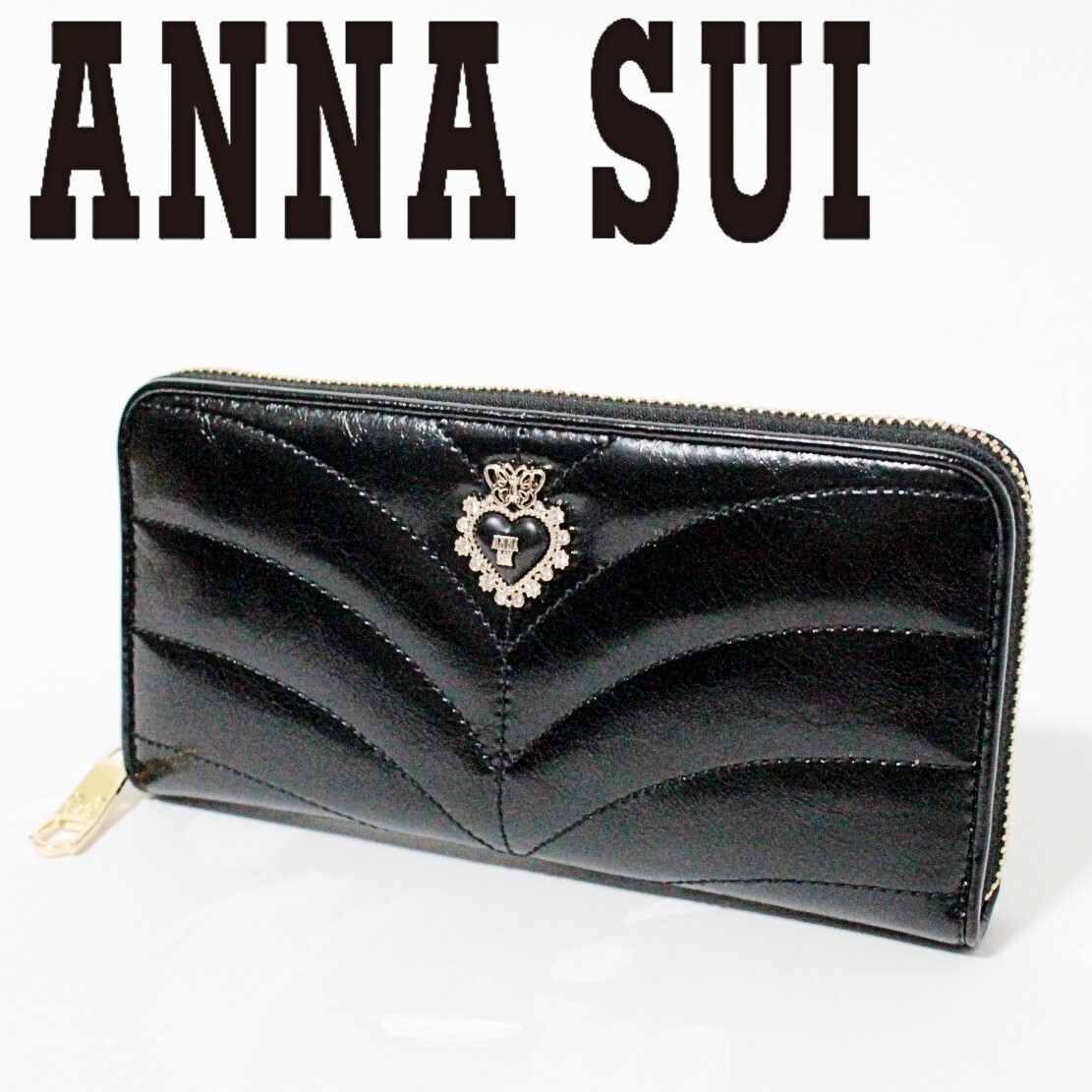 - 新品 箱付 アナスイ ふんわりステッチレザー ハートバタフライブローチ ラウンドファスナー長財布 黒 K5283