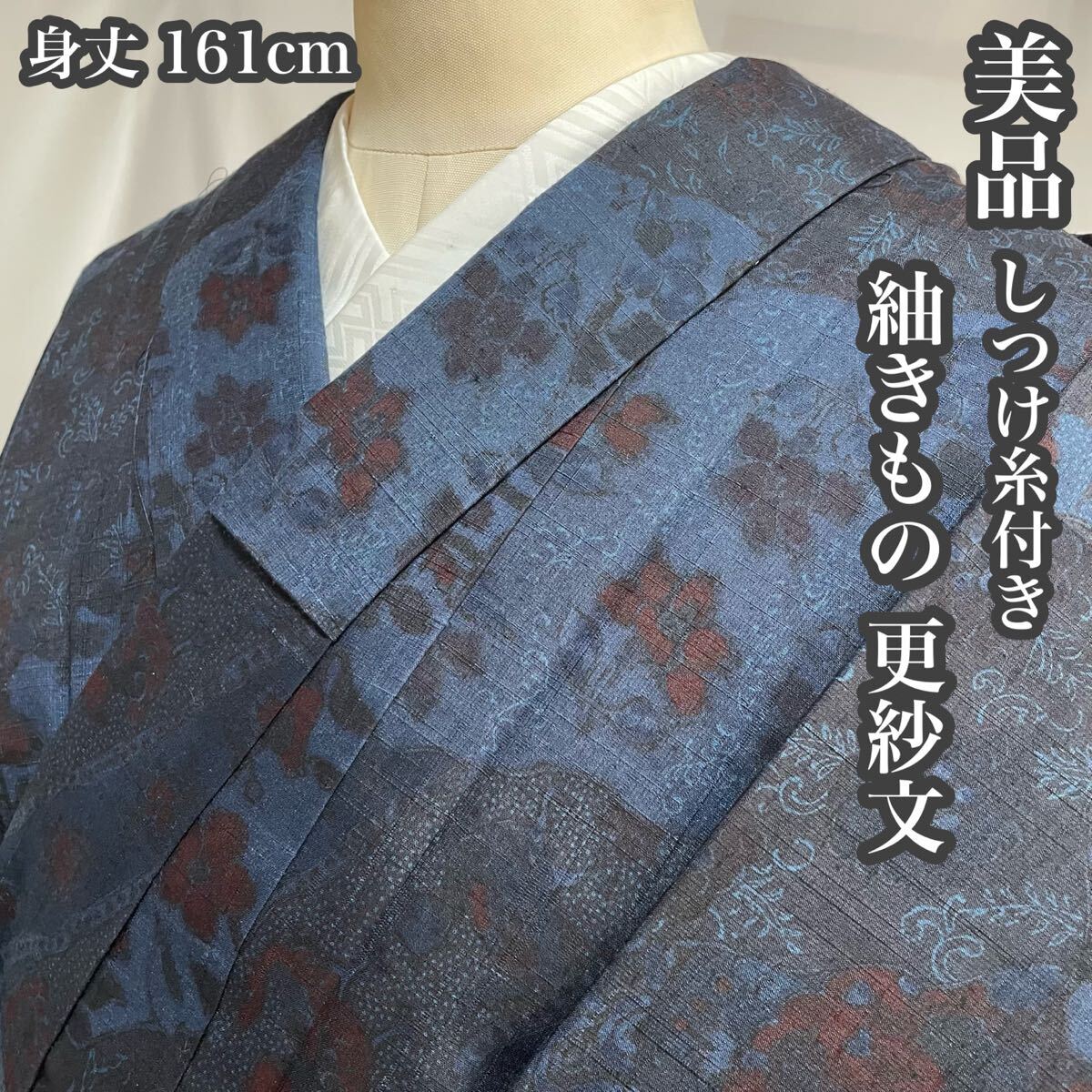 > #H525 美品 しつけ糸付き 紬きもの 更紗 藍染め 身丈161cm 和装 和服 着物【wellriver】