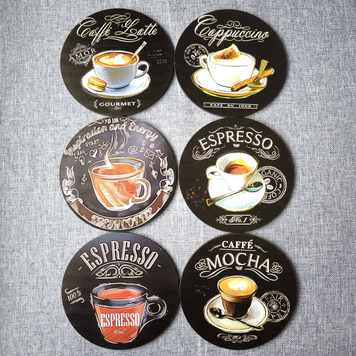- 【珈琲柄 6枚組 木製コースターセット】木材で作られた飲み物用のコースター 高品質 UV印刷 新品未使用品★