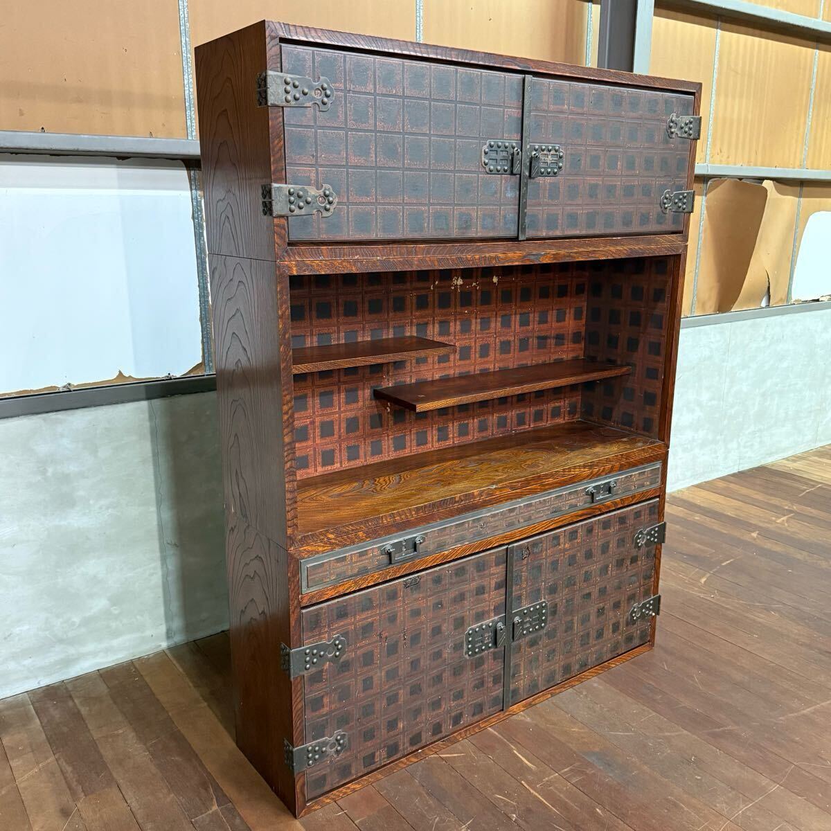 - H15K25 民芸城山 食器棚 和製ビンテージ 茶棚 収納棚 飾り棚 キャビネット 水屋 水屋箪笥 戸棚 カップボード 上置棚 和家具
