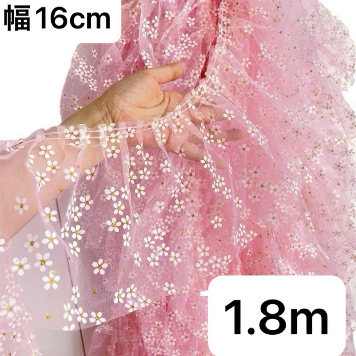 - 幅16cm 白 ホワイト 花柄 フリル チュール レース 長さ1.6m ピンク 花 金箔 手芸 ハンドメイド フラワー 生地 桜 ゴールド