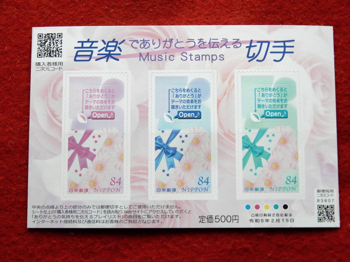 > 記念切手 音楽でありがとうを伝える切手 84円切手3枚 シール式 定価500円 令和5年(2023年)発行