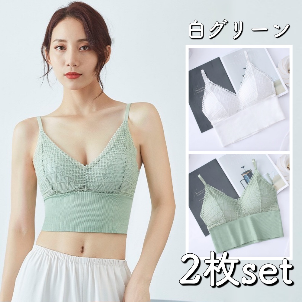 - 送料無料★即納!Cタイプ 2枚セット ブラトップ レディース パット付 スポーツブラ ノンワイヤー 美胸 ストレスフリー★白/グリーン