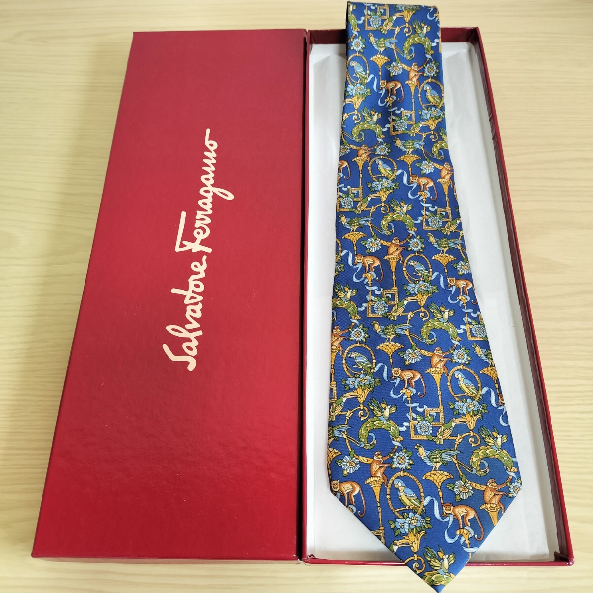 - Salvatore Ferragamo(サルヴァトーレフェラガモ)青猿鳥花模様ネクタイ
