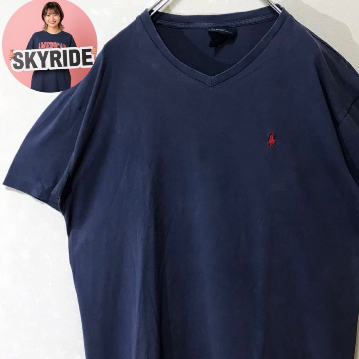 - Polo by Ralph Lauren ポロバイラルフローレン VネックTシャツ ネイビー 赤ポニー刺繍 ワンポイントロゴ メンズ M ゆるだぼ 人気 #TT0247