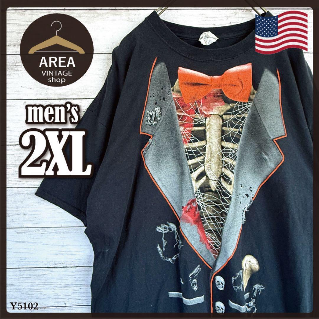 - 2XL Jerzees 骸骨タキシードTシャツ 骨柄 ハロウィン コスプレ風古着