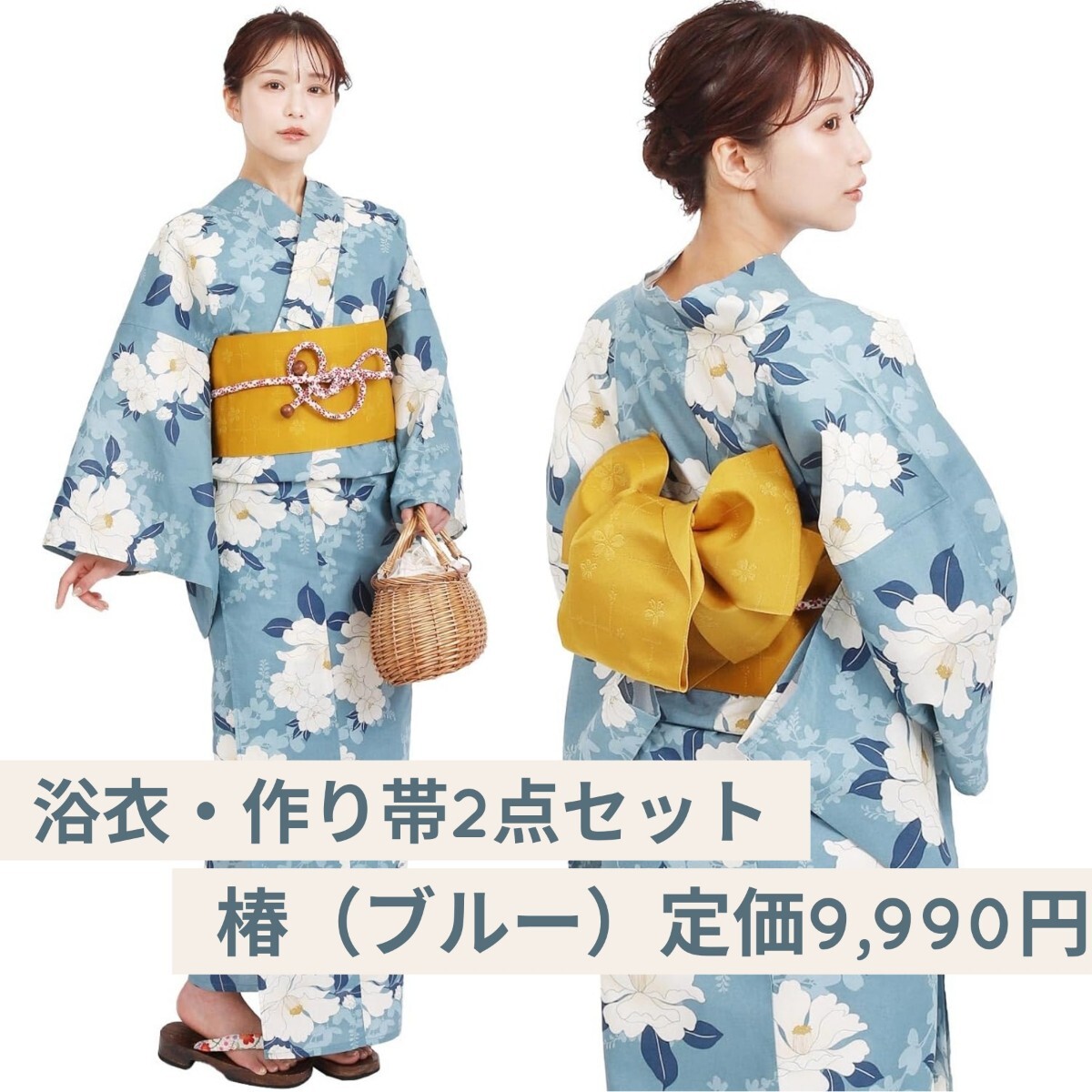 - 新品未開封☆定価9,990円 椿(ブルー)フリーサイズ Fuuka 風香 浴衣 作り帯 2点セット レディース ワンタッチ作り帯 黄色帯 水色 帯日本製