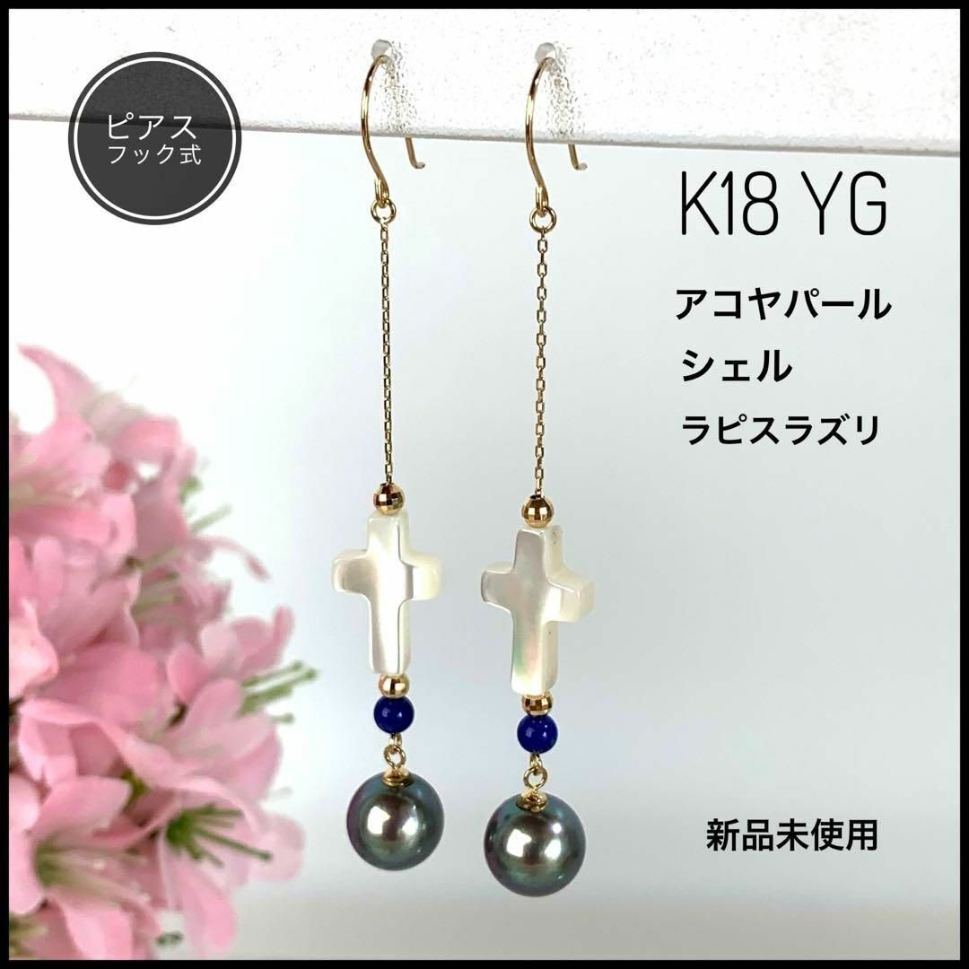 - K18 YG アコヤパール シェル ラピスラズリ フック式ピアス 【新品未使用】
