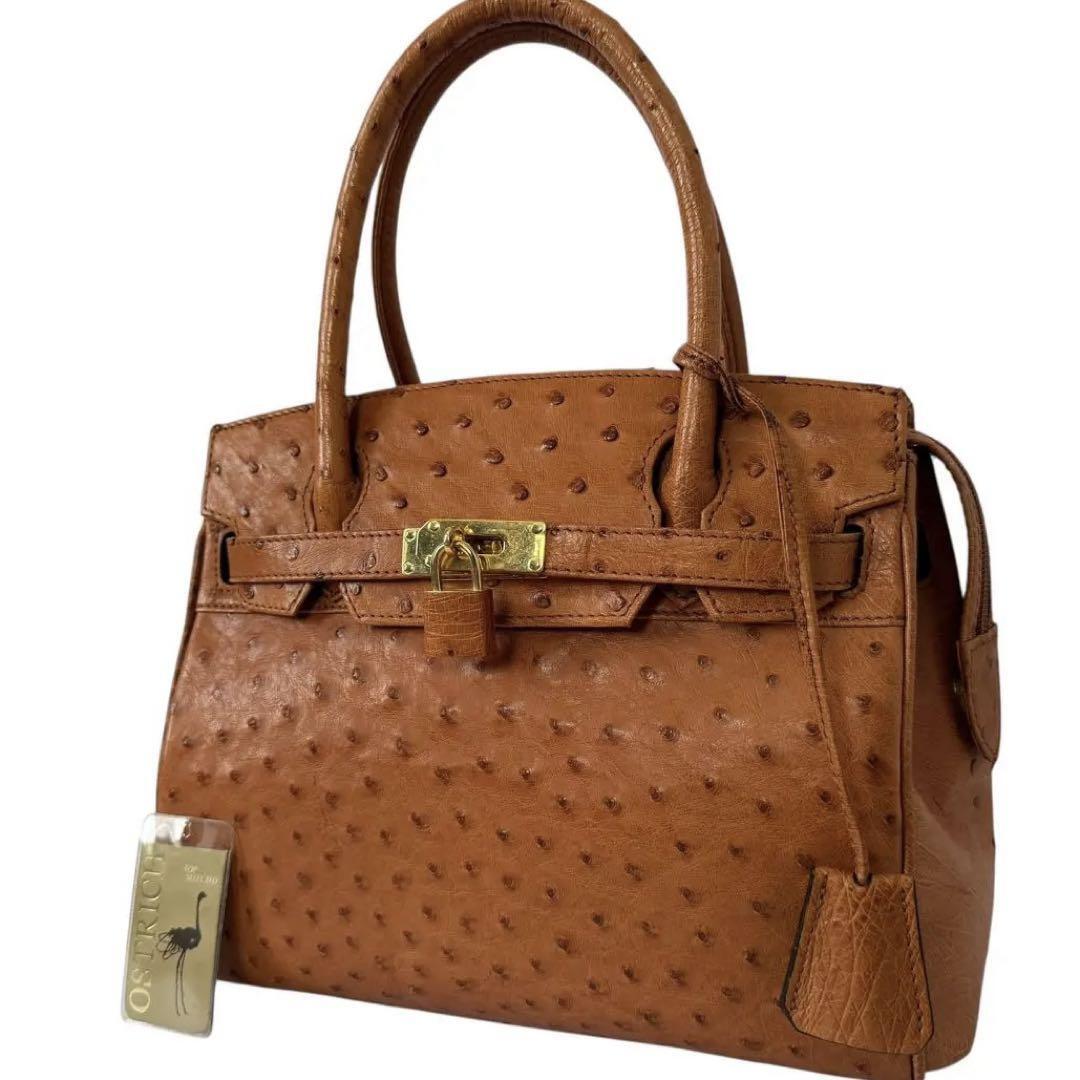 - 【人気の形/定価約15万】美品 オーストリッチ ダチョウ革 エキゾチックレザー トートバッグ ハンド 南京錠 パドロック 裏地スエード 茶色