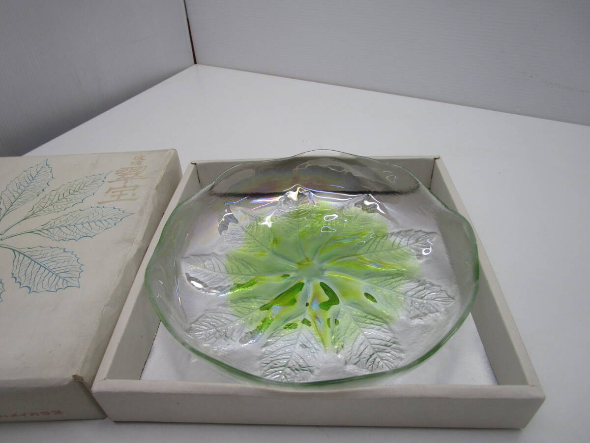 - P119★カメイガラス 「玻璃 翠宝」 花形 大皿 ガラス鉢★未使用品