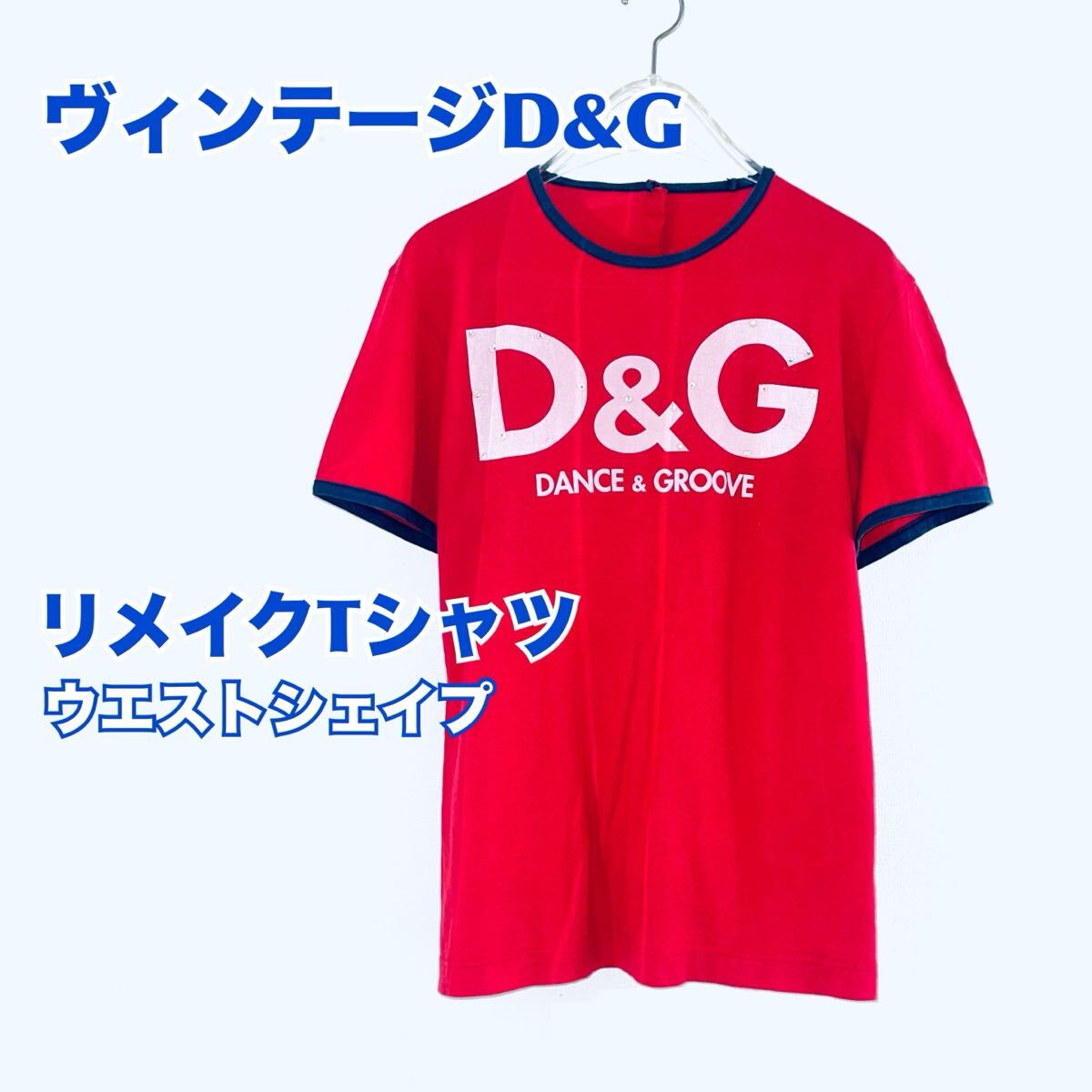 > D&G 正規品 Tシャツ ヴィンテージ リメイク ウエストシェイブ 赤 紺トリミング ラインストーン付 ラスベガス 送料無料