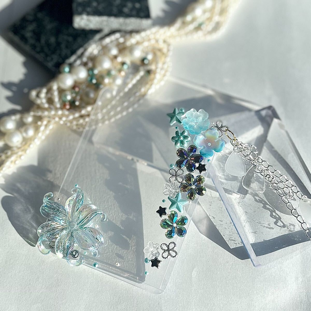 > トレカケースデコ B8 硬質ケースデコ フラワー ビジュー シルバー 花びら ブルー 青 ラインストーン ケースデコ ぱしゃこれ 推し活 ヲタ活