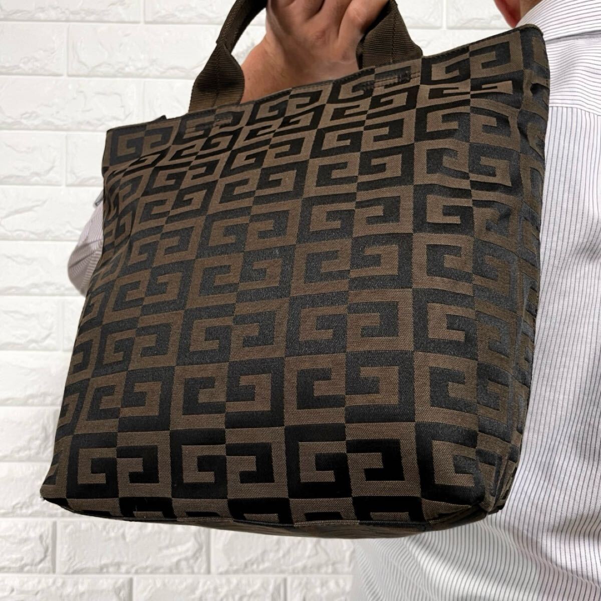 > 美品/希少◎ ジバンシー GIVENCHY メンズ ビジネス トートバッグ 4G 総柄 ロゴプレート金具 レザー 本革 キャンバス ダークブラウン