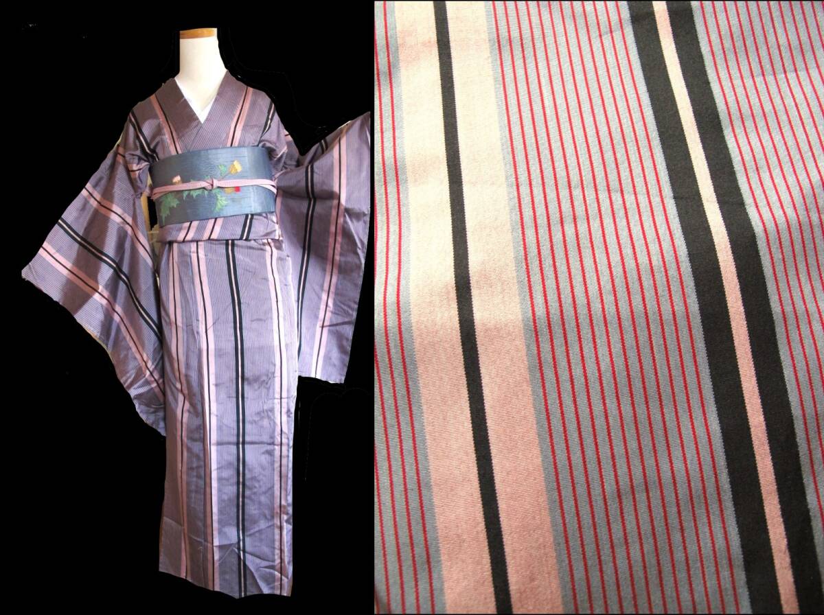- ピンク×灰 縞 単衣お召し着物 アンティーク着物 モダン