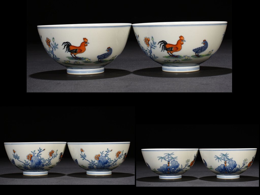 - ■XM108■清 雍正年製款 闘彩全家福鶏図紋碗一対 時代物 古玩 唐物 古陶磁器■