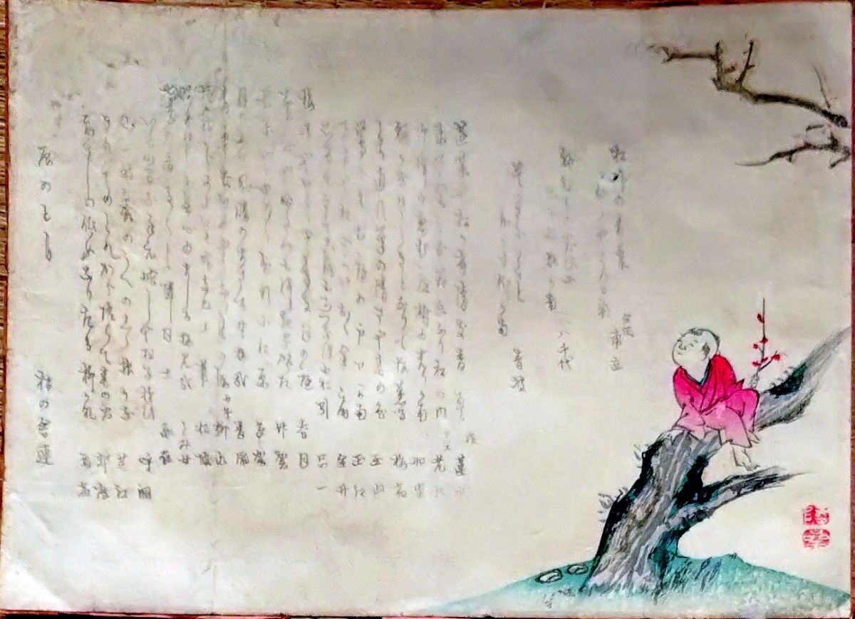 - f25071306〇一枚摺物 彩色木版 俳諧 俳句 画賛 明治時代〇和本古書古文書