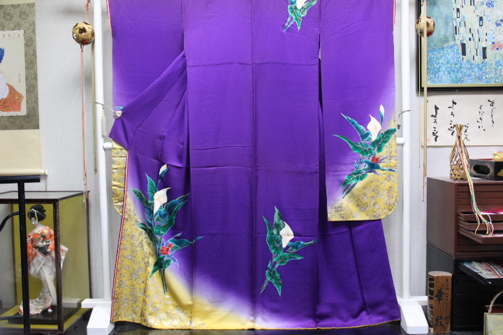 - きもの今昔8761 ふりそで 広衿袷手縫仕立 正絹梨地綸子 京紫色地に手描きのカラーの花と金箔の唐花添え 身丈166cm