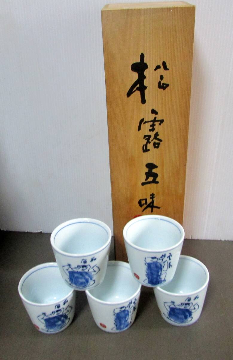 - 松露五味 清水公照/画 染付 蕎麦猪口(5客組)湯呑 木箱入り 径:(約:8.5cmxH7.5cm)