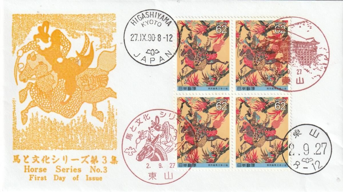 - FDC 1990年 馬と文化シリーズ 第3集 62円4貼4消し 鳴海
