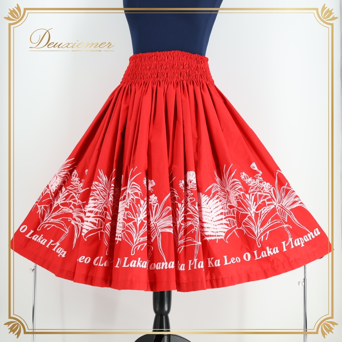 - 『送料無料』 【フラダンス衣装】レッド系 パウスカート 赤 白 葉っぱ柄 鮮やか ホワイト ハワイアンプリント アロハ かわいい ふんわり