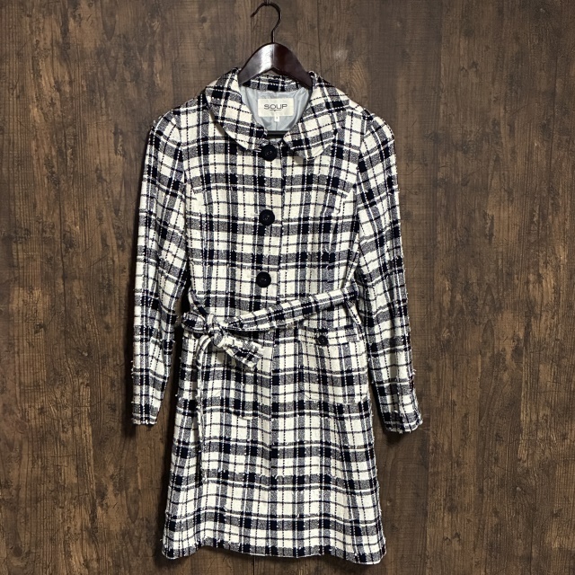 - A462◇SOUP | スープ ベルト付きチェック柄ツイードコート ネイビー×アイボリー レディース 9サイズ 中古品