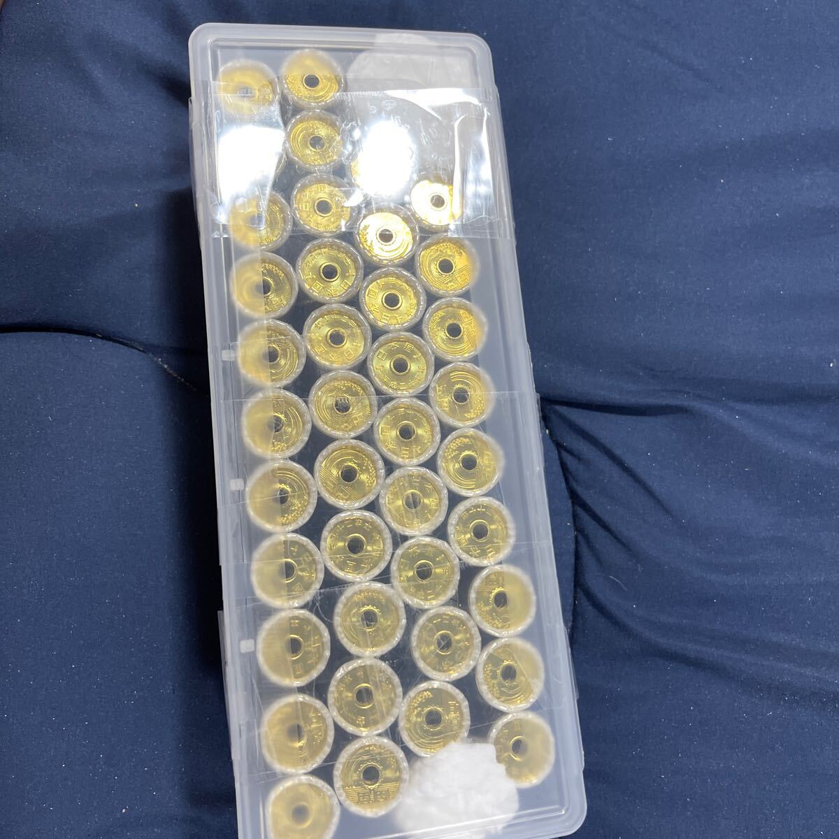 > 新品5円玉 等価金一万円分をプラケースに入れました重さ約8キロ有ります硬貨の年度はバラバラですが光って居ます新品です
