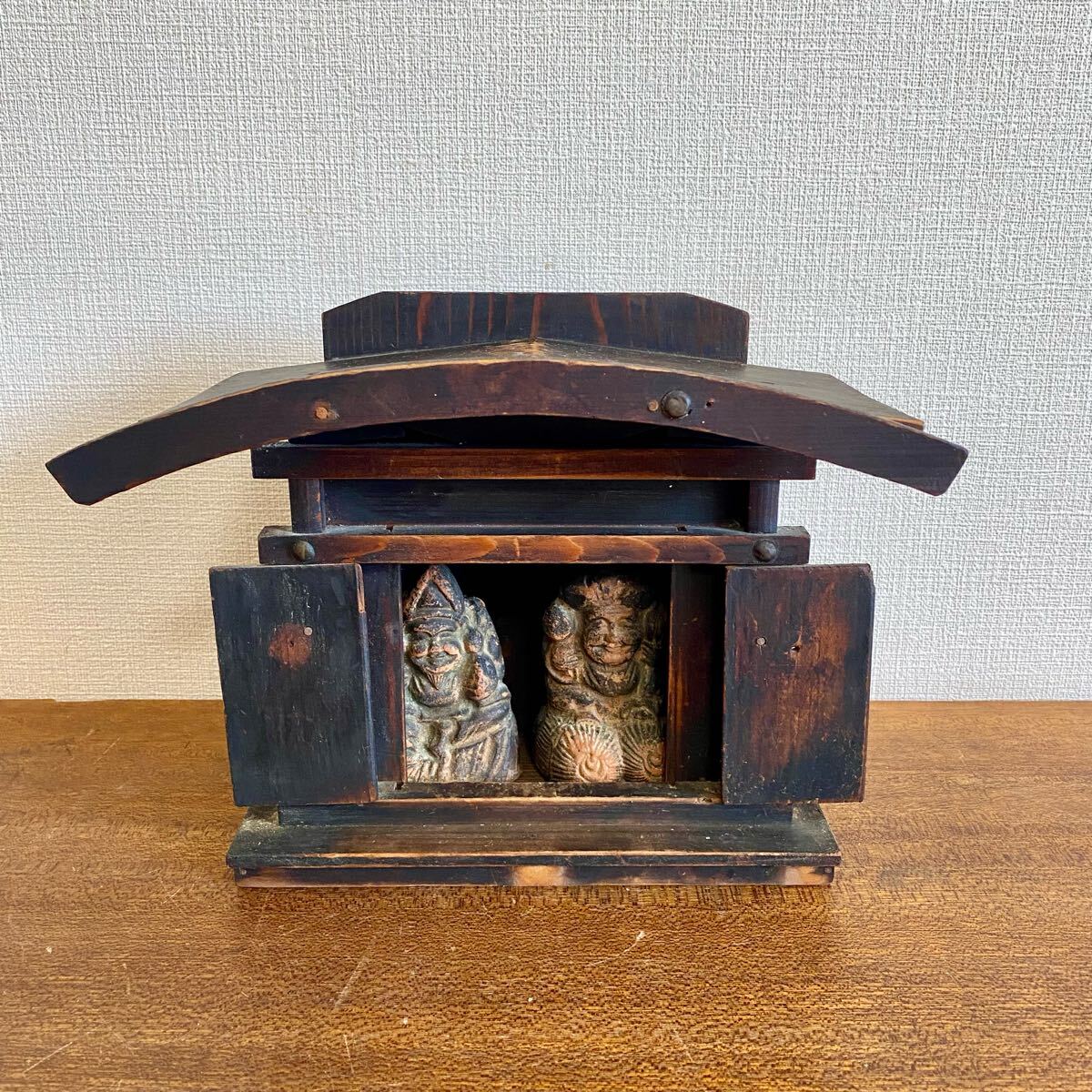 - 時代物 厨子入り 恵比寿 大黒天 縁起物 / 七福神 陶器 土人形 工芸美術 仏教美術 民衆仏 厨子