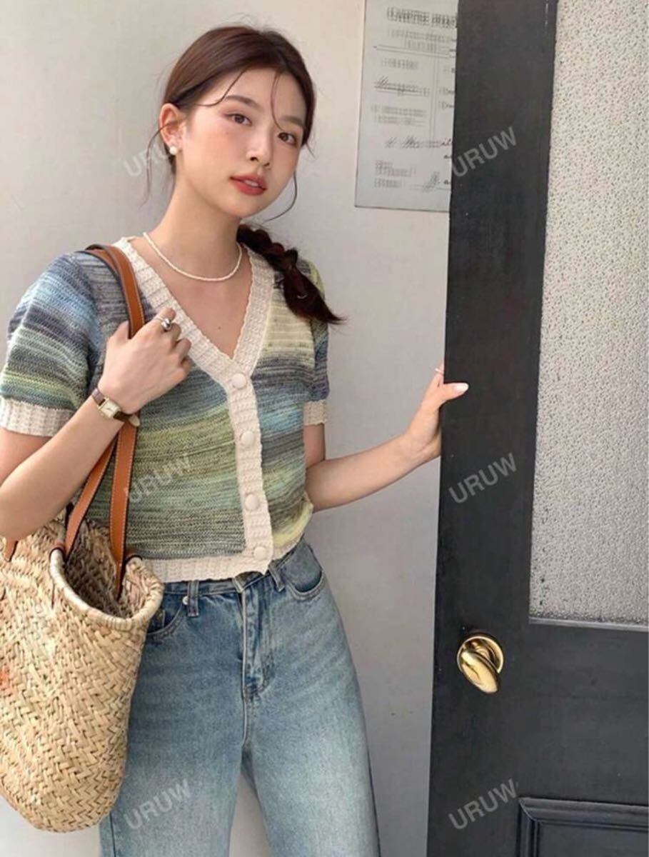 - ニットカーディガン ストライプ Vネック 半袖 ブルーとグリーン カラフル M