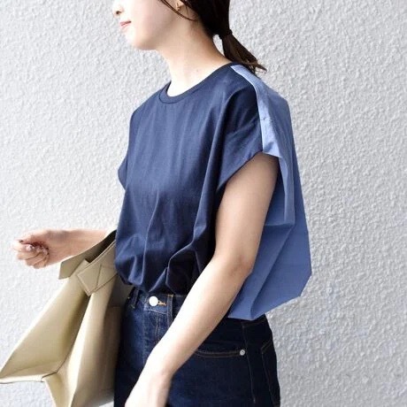 - SHIPSシップス 布帛ドッキングカットソー◆プルオーバーコンビ切替配色フレンチスリーブ IENAトゥモロージャーナルアローズ ネイビー系