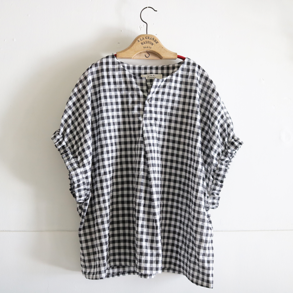 - 【koko cinema】フランス映画のようなお洋服 [ギャザーブラウス] ブラック ギンガム/ブラウス ハンドメイド アンティーク ビンテージ