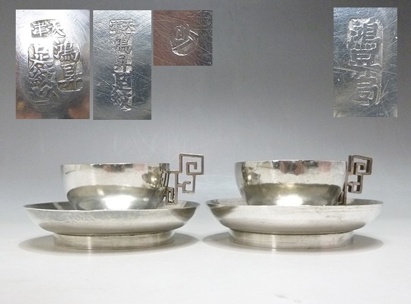 > 《ジャムルK》◆kks0723-13◆中国美術 鴻昇局 天津鴻昇 足紋 少 銀製 カップ ソーサー 2客 計280g 茶器 酒器 時代物 年代物